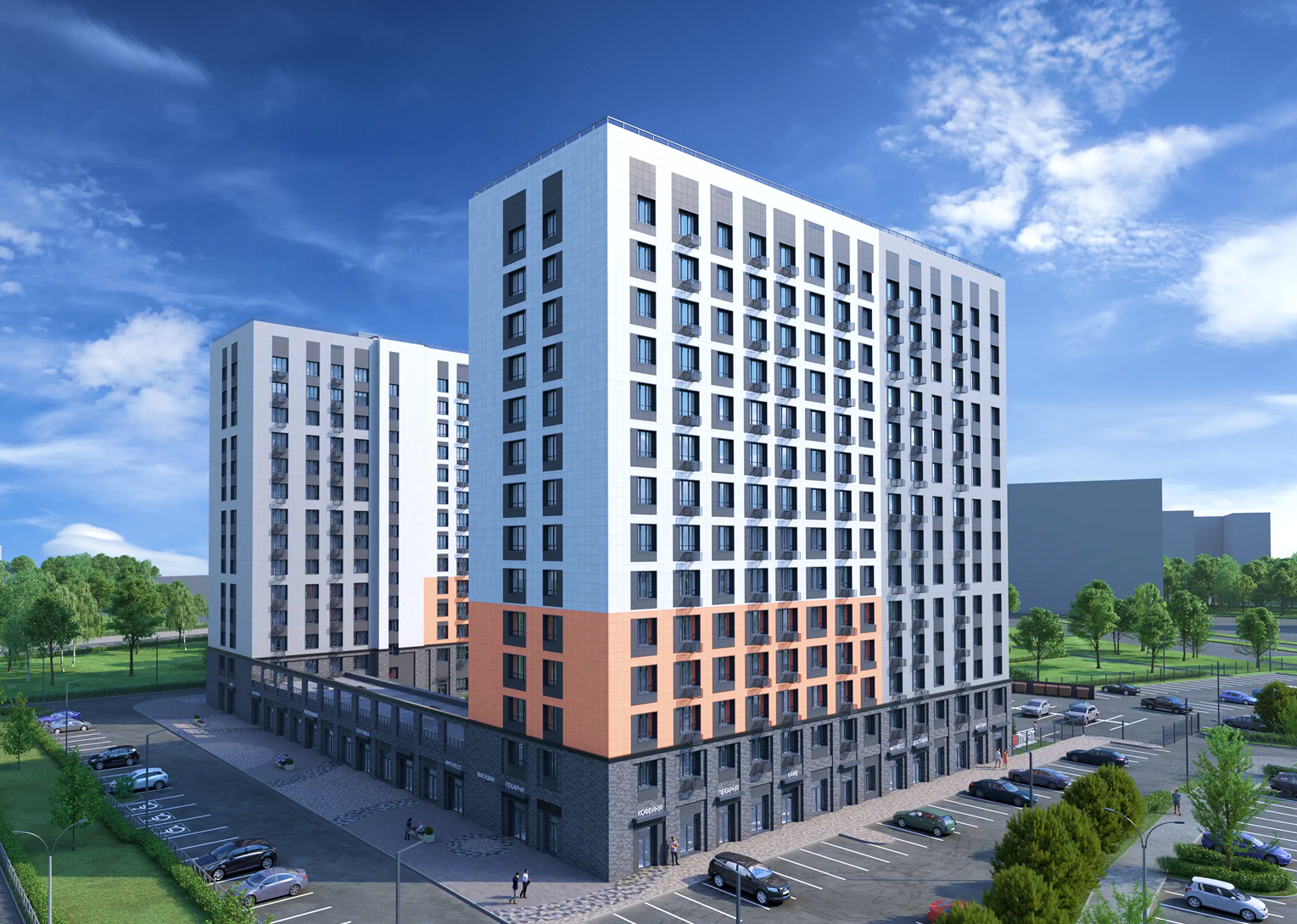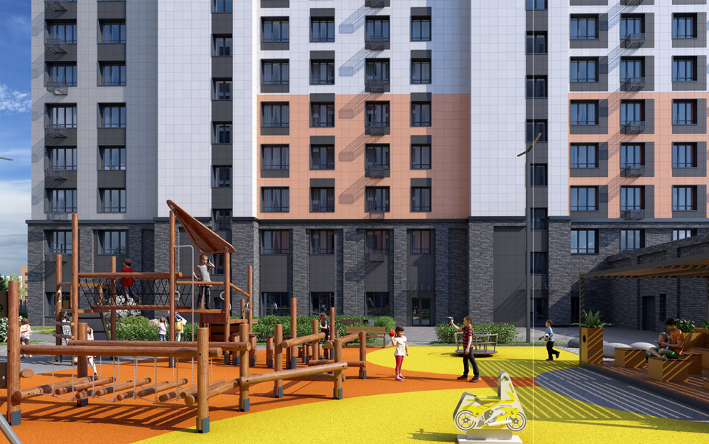 Жилой комплекс "Дуэт" представляет собой четырнадцатиэтажное кирпичное здание