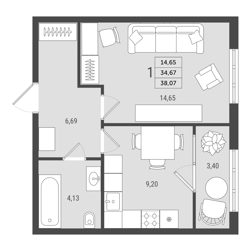 Площадь: от 38,07 м2